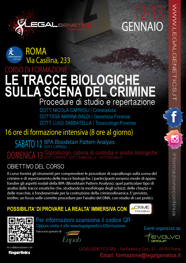 Info e modulo di iscrizione al link http://www.legalgenetics.it/le-tracce-biologiche-sulla-scena-del-crimine/