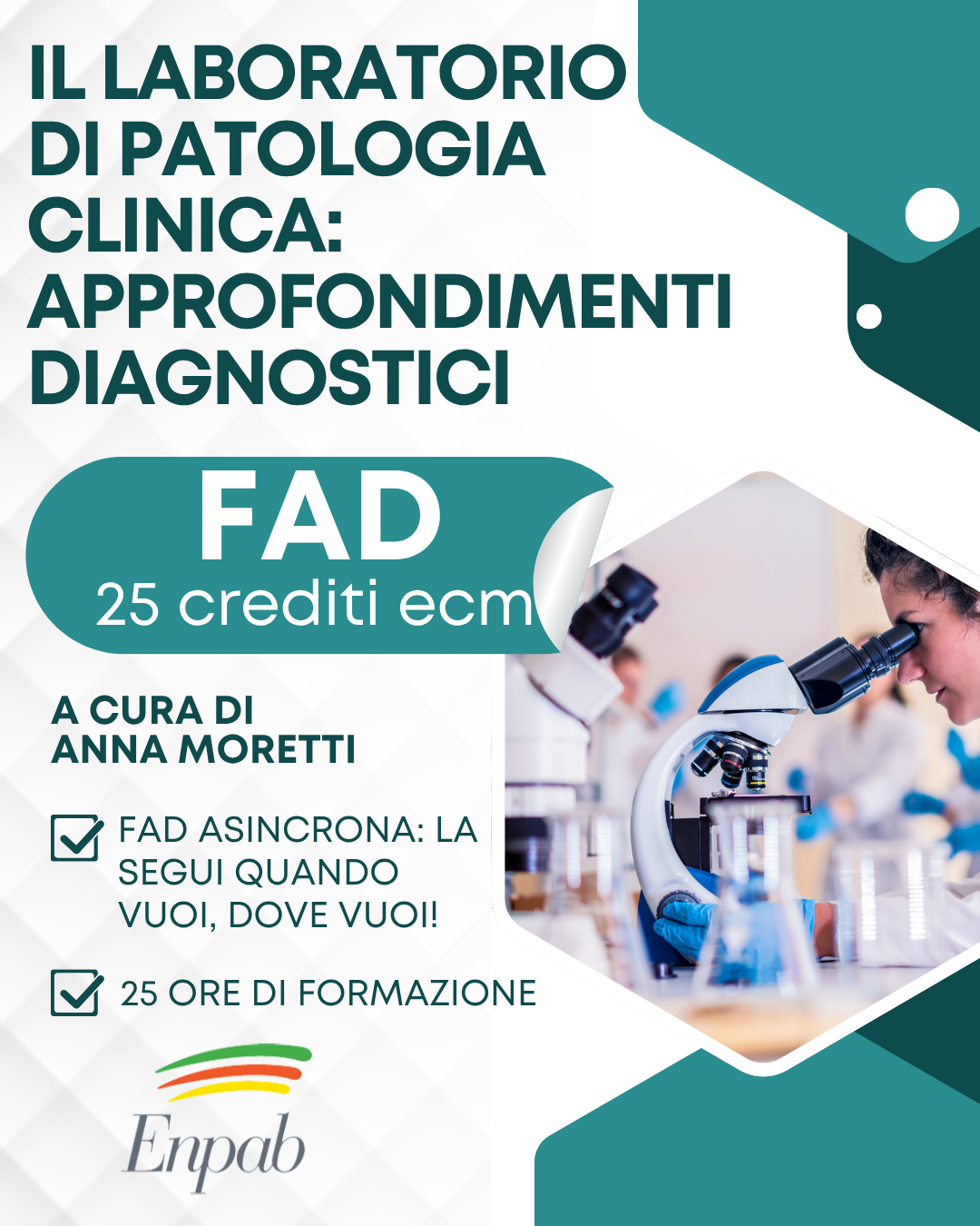E' online su fad.enpab.it il nuovo corso FAD "Il laboratorio di patologia clinica: approfondimenti diagnostici", un percorso ricco e aggiornato per approfondire le principali aree della diagnostica di laboratorio: dalla fase preanalitica all’emocromo, dall’emostasi ai marcatori tumorali, dalle patologie metaboliche e autoimmuni fino agli aggiornamenti su HPV e malattie infiammatorie intestinali.