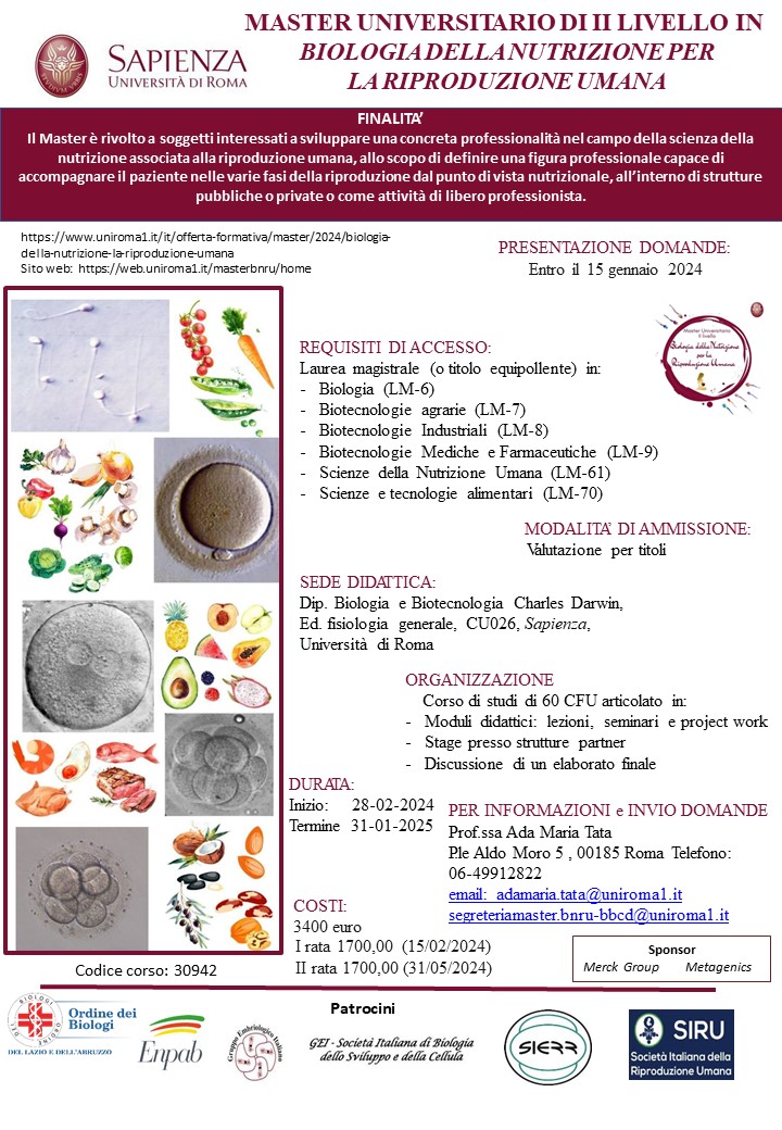 È online il bando per la IV edizione del Master in Biologia della Nutrizione per la riproduzione umana presso l'Università di Roma, la Sapienza, patrocinato da Enpab.