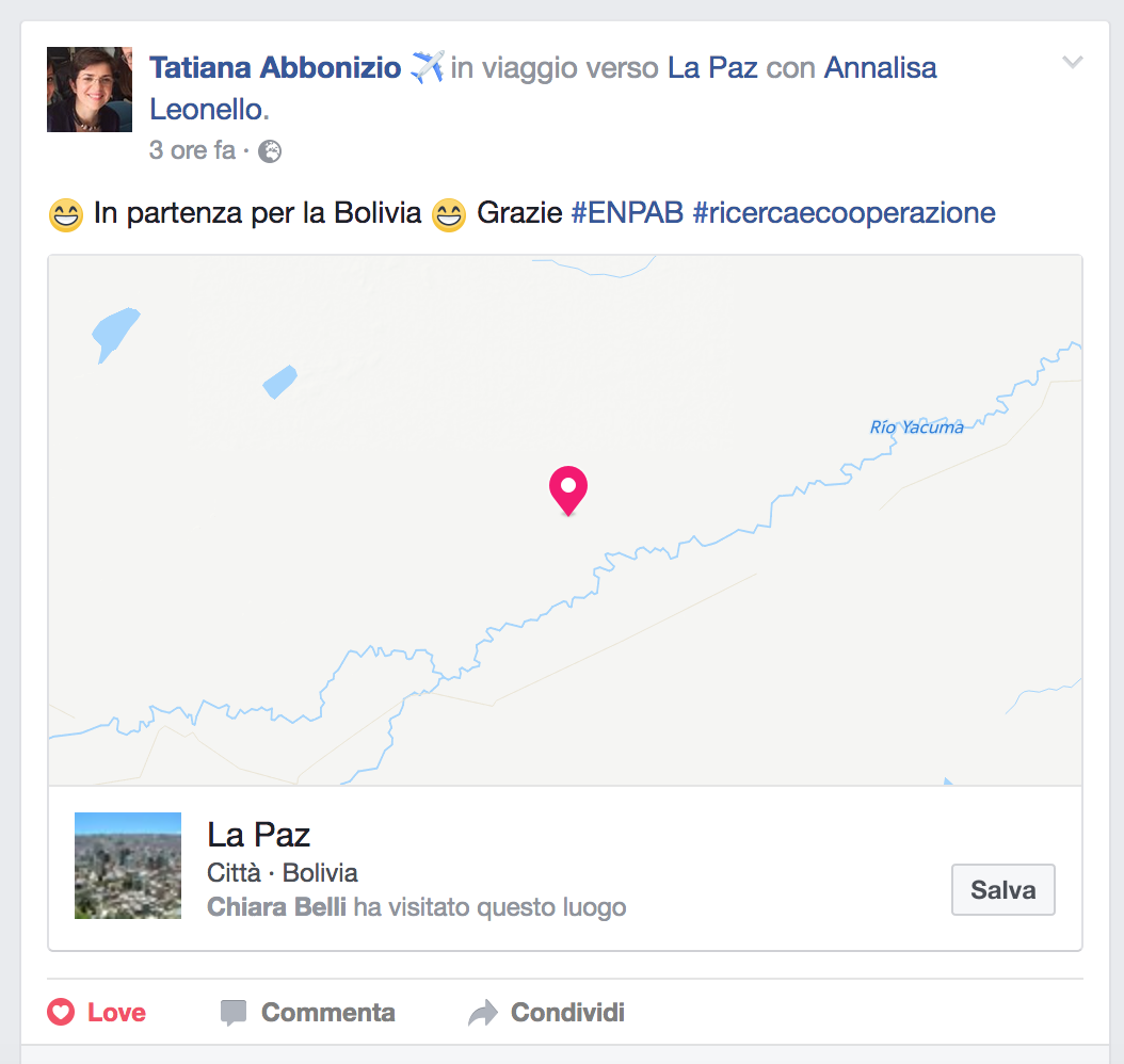 Continua l'esperienza "Biologi all'estero" messa a bando dall'Enpab. Annalisa Lionello e Tatiana Abbonizio, due delle tre Biologhe vincitrici del Progetto, sono partite alla volta della BOLIVIA. Tanto entusiasmo e soprattutto grande appartenenza alla famiglia ENPAB che, in collaborazione con l'organizzazione non governativa (ONG) Ricerca e Cooperazione, ha sostenuto l’opportunità di una esperienza formativa all’estero.